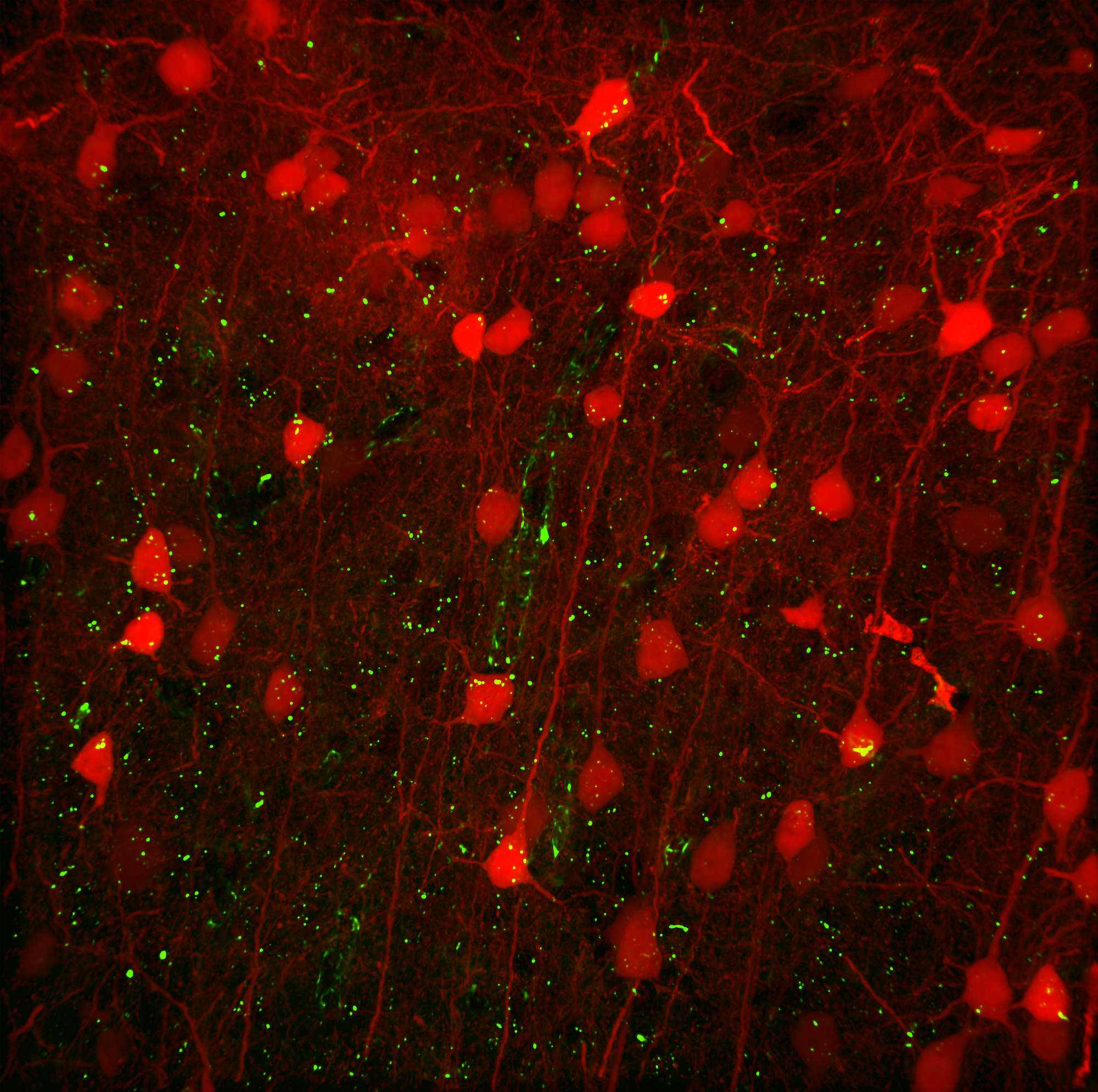 Image above by Anastasia Brodovskaya. Super-resolution microscopy image of the activated neurons in the cortex after a seizure in activity reporter mice.