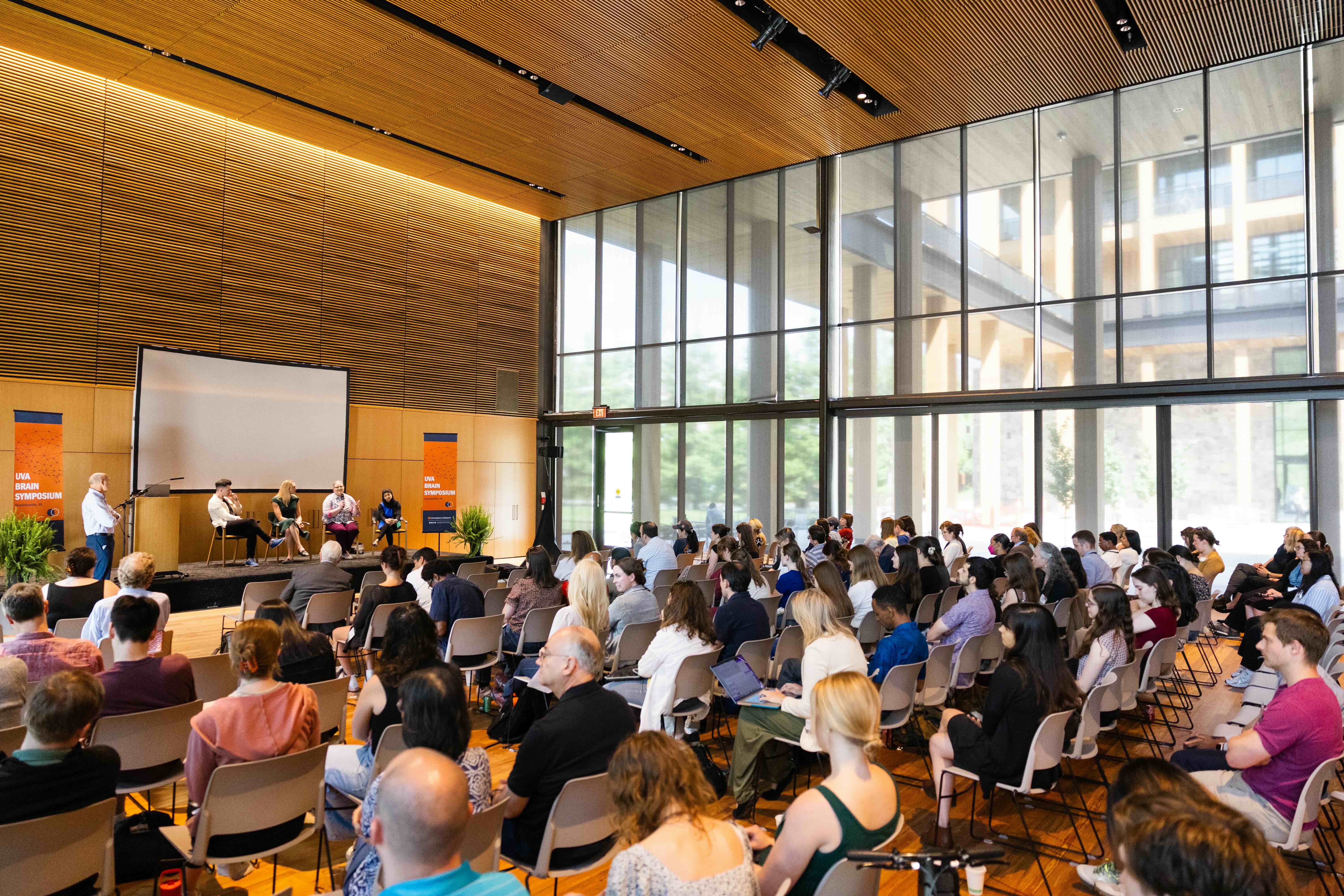 The 2024 Brain Symposium was the first major event to take place in the new UVA Contemplative Commons building on Emmet Street, a new multipurpose building dedicated to helping students and our communities flourish in all aspects of their lives. The 57,000-square-foot building, located in the heart of UVA Grounds between Bavaro Hall and the Dell Pond, incorporates several new outdoor spaces, including contemplative gardens, a tree-lined courtyard, and a new green pedestrian bridge across Emmet Street. The Brain Institute would like to thank the entire Contemplative Sciences Center and construction teams for their help to make the Symposium a success in this new space!